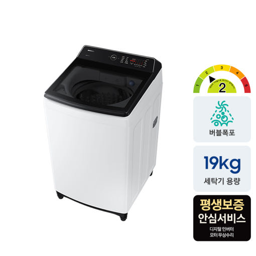 | 삼성 그랑데 통버블 세탁기 19kg WA19CG6745BW (화이트) | ✅ 2023년형 (가성비 모델) ✅ 버블폭포, 제트샷 세탁 (워터샷/AI 제외) ✅ 스마트체크 (간단 자가진단) ✅ 에너지효율 2등급 |